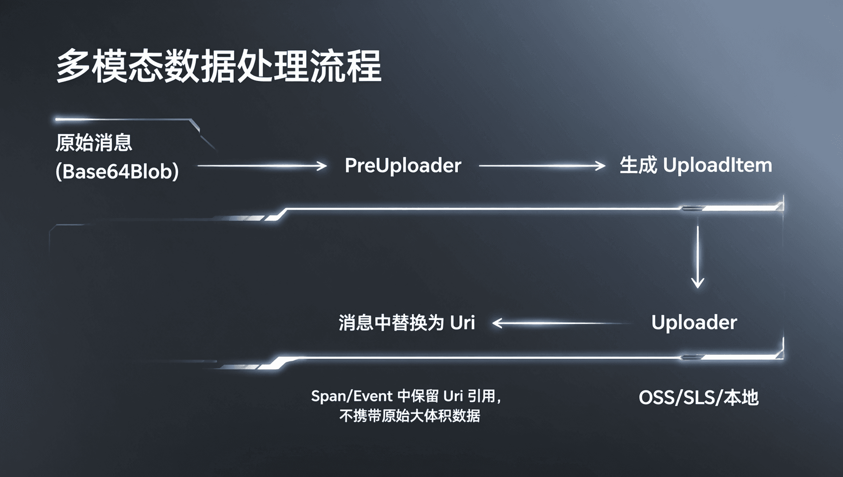 图片、音频、视频等多模态内容体积大,如果直接塞进 span/event,会拖慢链路、增加存储压力。LoongSuite GenAI Util 提供**「多模态剥离上传」**:把大体积内容异步上传到 OSS/SLS/本地,在消息中只保留可引用的 URI。