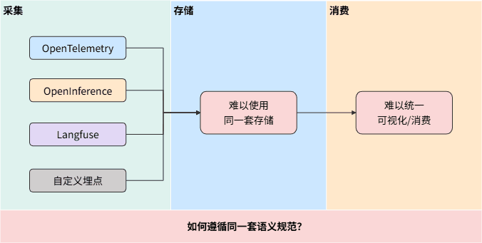 各类采集工具相当丰富,如 OpenTelemetry、OpenInference、Langfuse,一些成熟的框架本身也可以产生一些可观测数据,如 AgentScope、LangChain(LangSmith)等。这些可观测数据的命名、属性(标签)及其含义各不相同,我们一般称其为“数据语义”。数据采集到了,但如果各数据源各说各话,彼此语义不一致,就会出现: