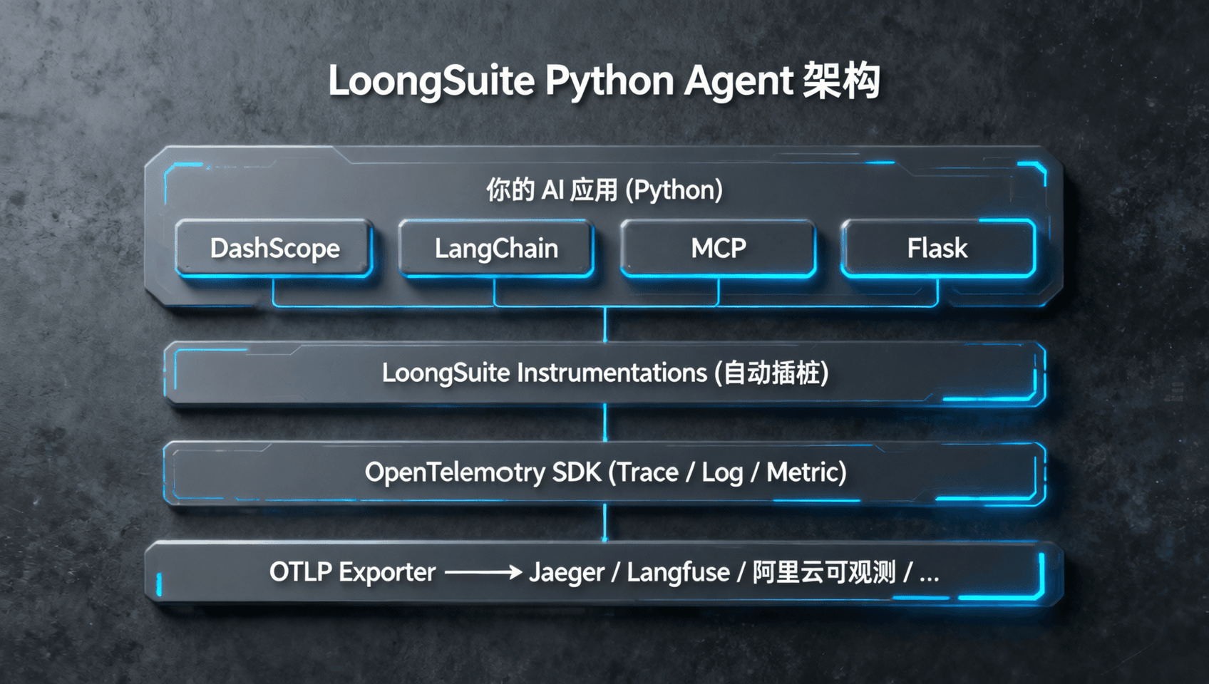 LoongSuite Python 探针 是 OpenTelemetry Python 探针的阿里云开源发行版,致力于让 AI 应用的可观测性更敏捷、更高效——既承接上游标准,又沉淀商业化实践,并持续将新特性贡献回社区。